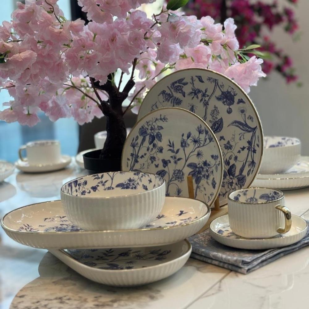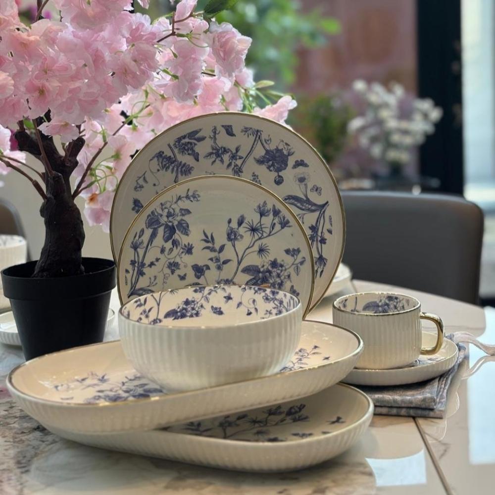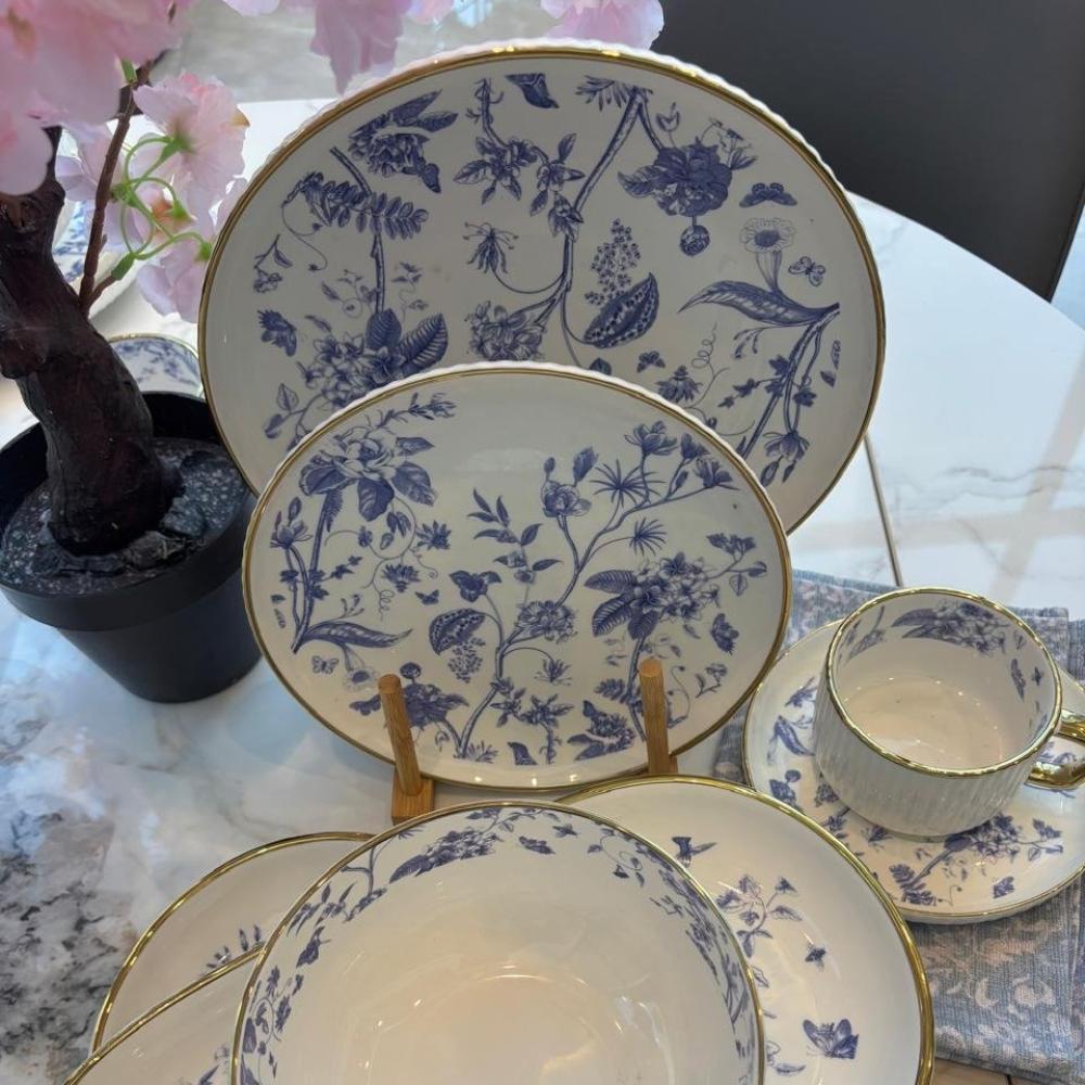 - ( 6 صحون كبيرة , 6 صحون صغيرة , 6 بوادي , 6 أكواب مع 6 صحون، 2 صحن طويل ).